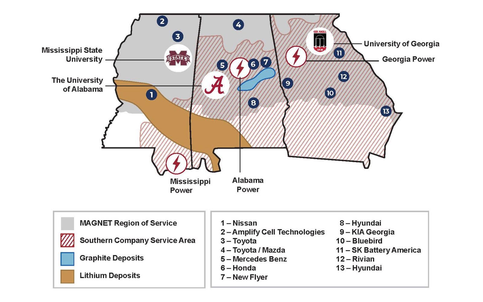 TUSCALOOSA, Ala. — Area governors, power company executives and university presidents recently established the Mississippi-Alabama-Georgia Network for Evolving Transportation, or MAGNET for short — a regional economic development initiative aimed at leveraging the Southeastern U.S. automotive vehicle and battery industry to stimulate economic development and job growth.