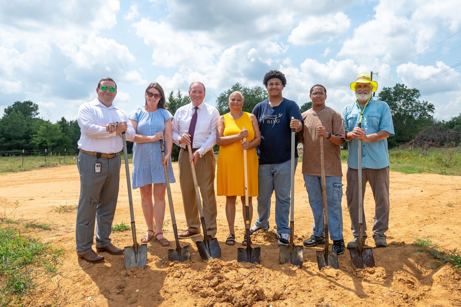 MSU President Mark E. Keenum joined Vice President for Student Affairs Regina Hyatt, Director of Student Leadership and Community Engagement Kathy Jones and Starkville Habitat President Austin Check in celebrating the groundbreaking with the Latham family.