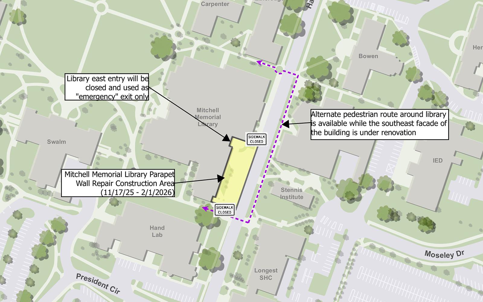 Beginning Monday [Nov. 17], the east entrance to Mitchell Memorial Library along Hardy Road will close due to renovations to the building’s southeast facade.