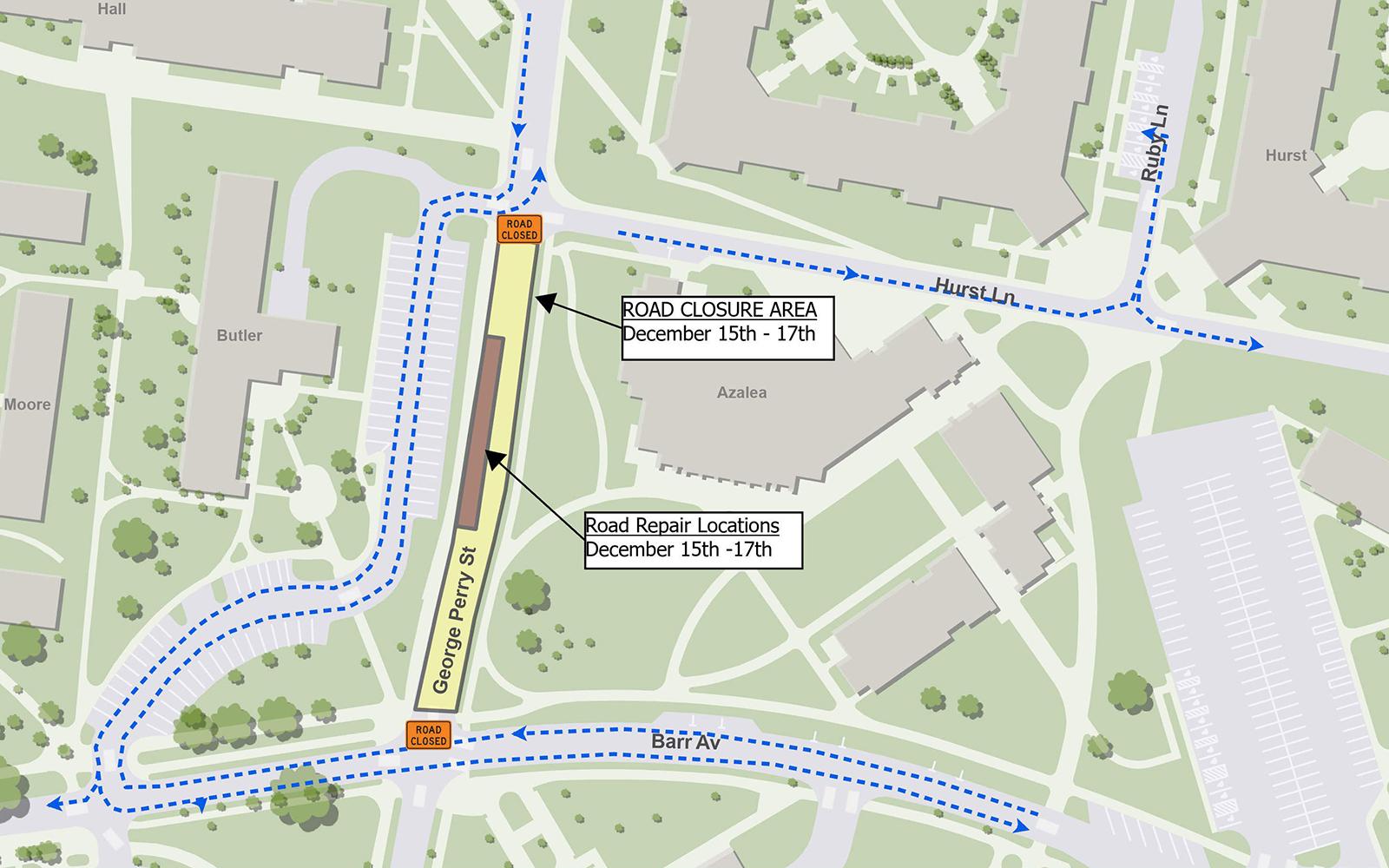 George Perry Street, from Barr Avenue to Hurst Lane, will close Dec. 15-17 for repairs, while Ruby Lane also will close on Dec. 17.