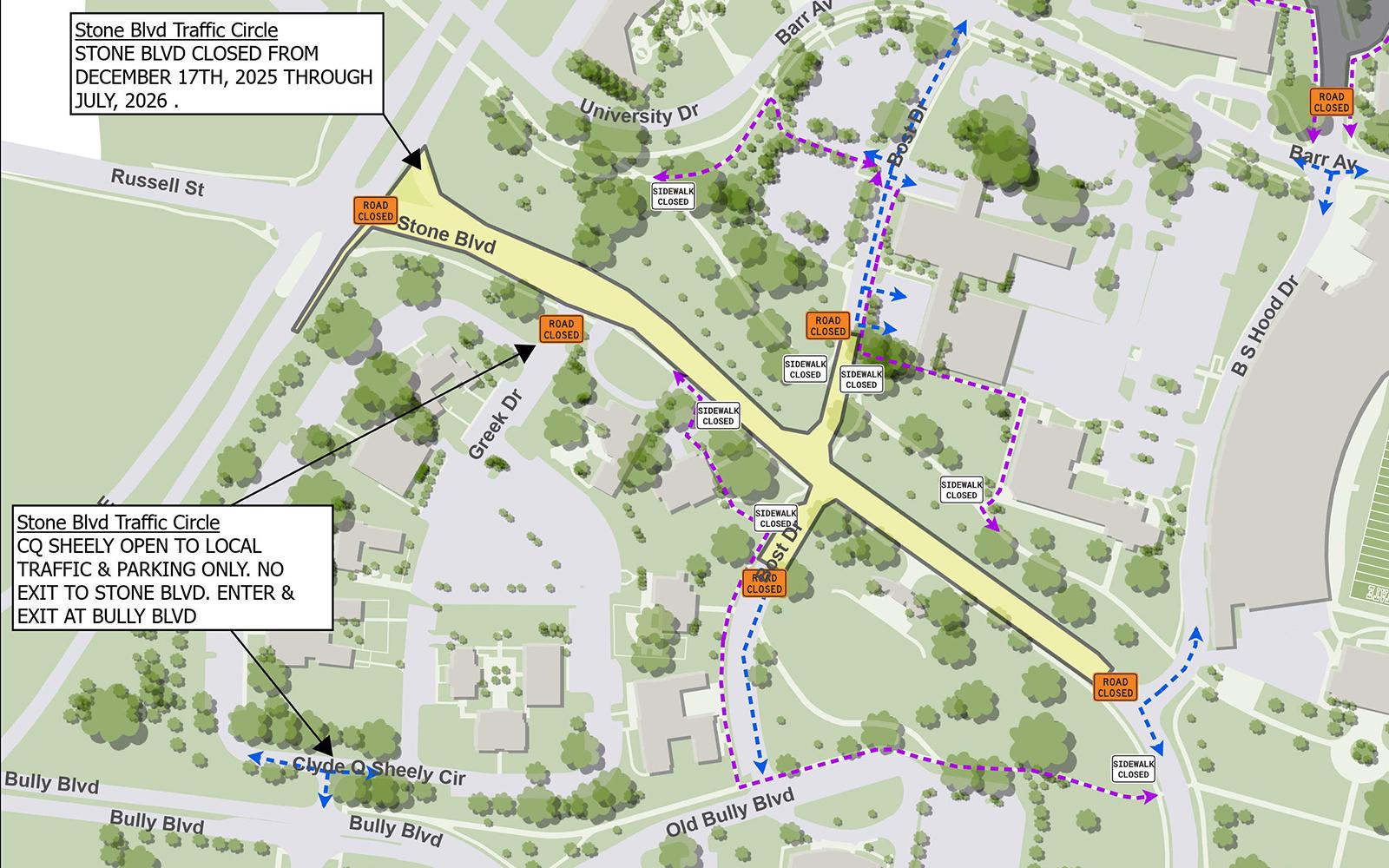 The west side of campus will remain accessible via University Drive, College View Drive and Bully Boulevard.